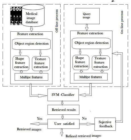 A method for finding efficient high performance content based medical information retrieval system with multiple feature extraction.More particularly, the present invention relates to a method for MRI tumor image retrieval for supporting computer aided diagnosis.A method for similar image retrieval from a database, said method comprises the following steps:(a) Inputting an image from a user for searching;(b) Extracting relevant features from said input image and stored database images;(c) Comparing the similarities between said input images with said stored database images; and(d) Retrieving s