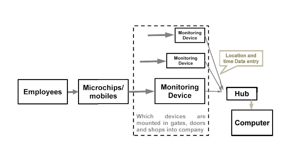 Present invention provides an employee monitoring and automatic attendance to origination without any disturbance to the employees. More particularly, the invention provides wireless communication modules to help the workers/operators for monitoring their work. According to an embodiment of the invention, there is provided an employee monitoring system, said system comprises: a microchip to be carried by the employee; a device for scanning the microchip; a computer system for receiving information from the device; wherein the device scans the microchip and transfer the information related to location of the employee to the computer system, via Internet of Things.