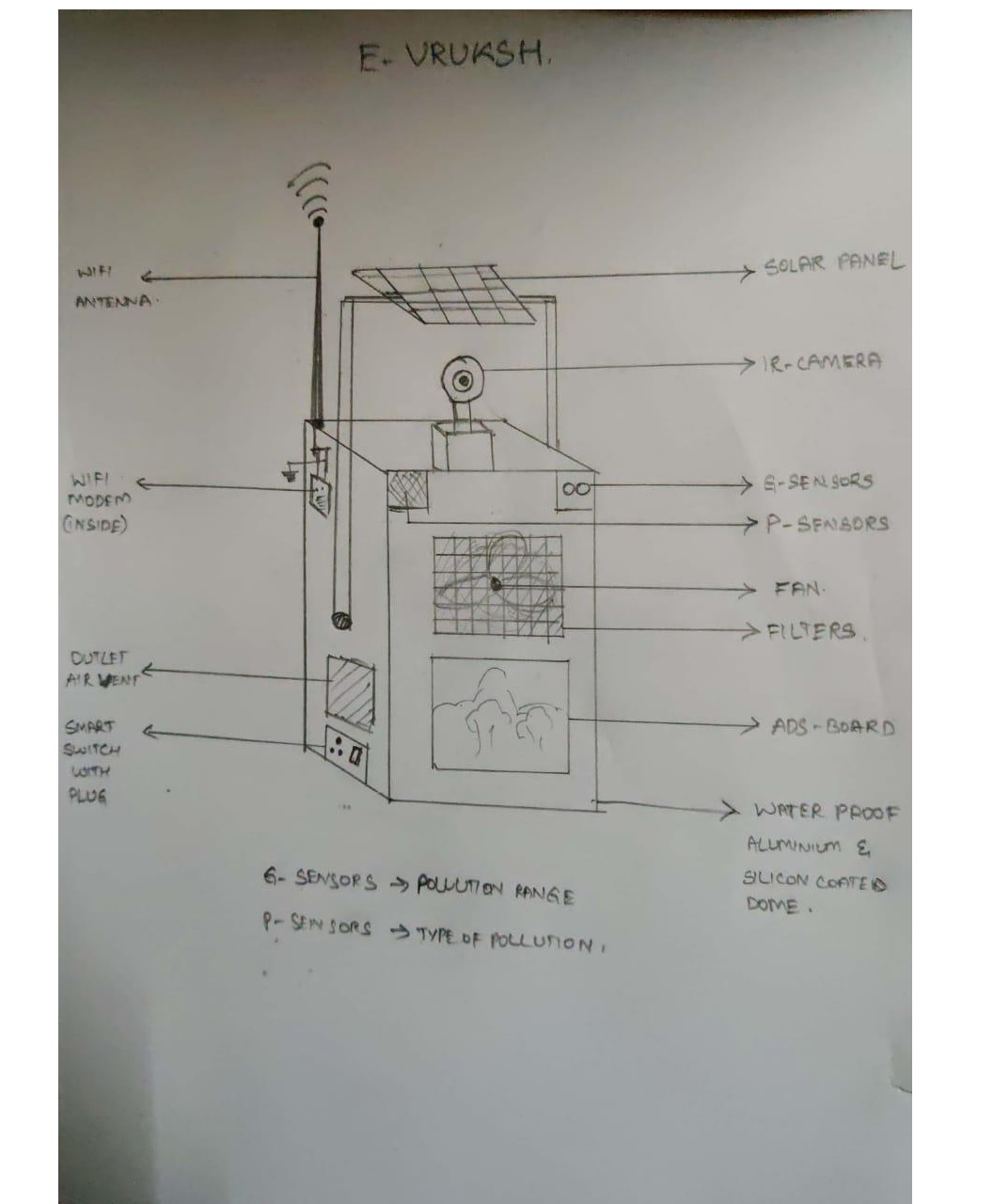 E-Vruskh starts with the monitoring of live pollution levels through inbuilt sensors. Whenever the PPM levels in the pollution rises, E-Vruksh’s air filter turns ON automatically. It sucks the polluted air and passes it through a set of filters. All the harmful pollutants are filtered and cleaned air is sent out. E-Vruksh records and maps the PPM levels of the pollution in the city. It has a solar power panel through which power is produced and stored in a battery. The battery is used to run E-Display boards, which in turn generates revenue. The battery is also used to charge Electric Vehicles and smart devices, both of which generates revenue. Thus E-Vruksh becomes self-sustainable for its maintenance. E-Vruksh has an inbuilt camera which can be used for surveillance and vehicle speed detection. It has a wi-Fi module to provide internet access at important locations in the city.